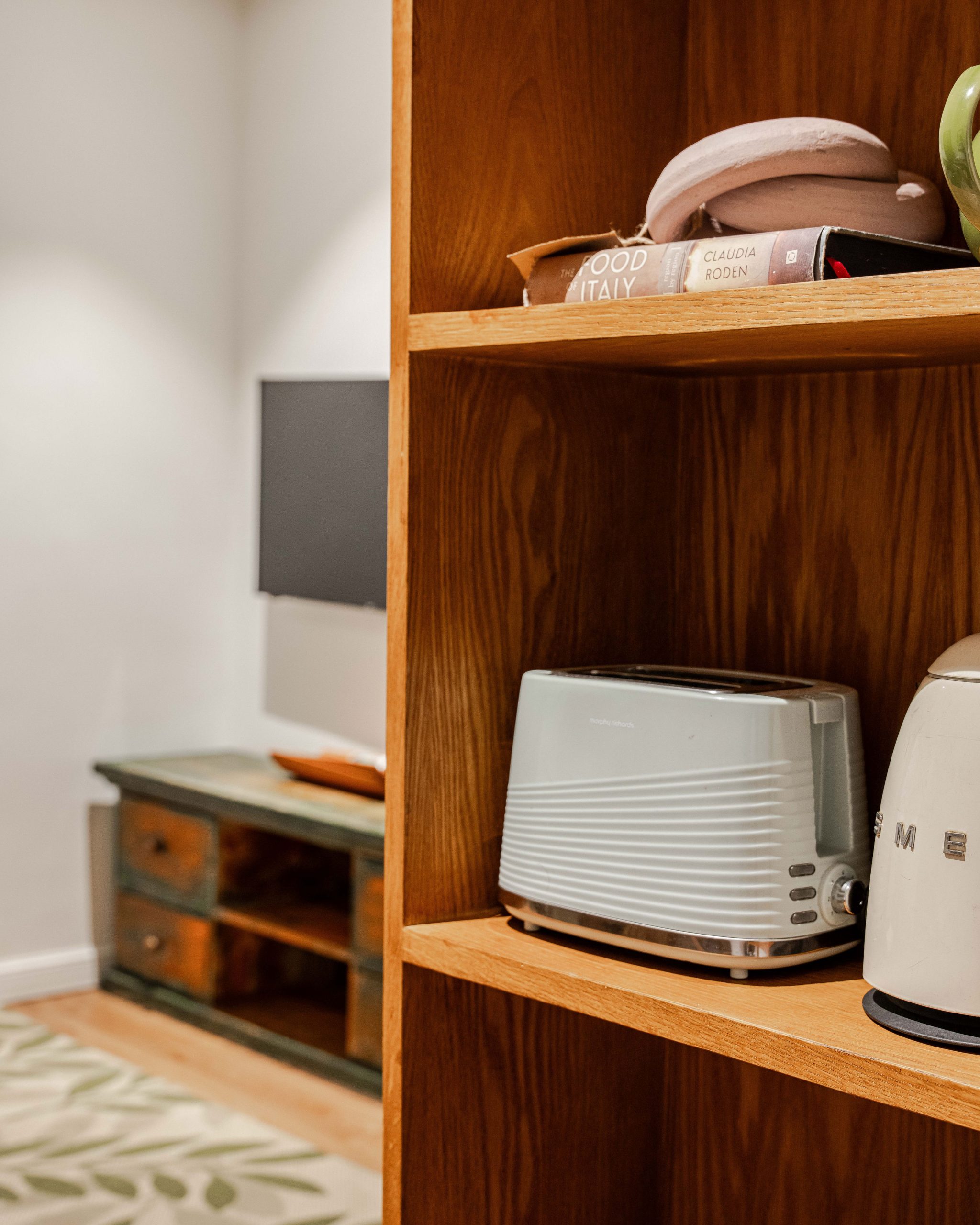 Chioma Okon’s design style and color palettes are from earthy tones, neutrals, greens, and terracotta, with her TV Console from the JagaJaga collection, an L-shaped sofa, a kitchenette equipped with a microwave, a fridge, an extractor, sink, electric kettle, toasters, and a wide range of cutleries with a broad collection of books.